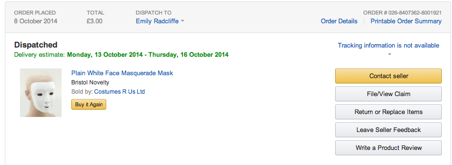 This is a screen shot of the oder that we have placed for the mask that we need for our antagonist.Between the 4 of us we are all going to bring in candles that we own, the reason for this is because we do not have a big budget to allow us to buy everything. Once again with the knife's we are going to films ones that we already have as we already have then and we don't want to waste our budget.